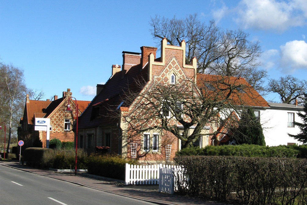 Verstärkt wird ein solcher Eindruck noch durch die in England vornehmliche Verwendung von Backstein und die Ausführung des Sichtmauerwerks in Zierverbänden aus gelben und roten Ziegeln. Staffelgiebel und dekorativ gestaltete Schornsteine und Schornsteinköpfe komplettieren den Eindruck, man habe es hier mit englischen Country-Cottages zu tun - insgesamt ein für Mecklenburg sensationelles, weil singuläres Architektur-Ensemble.